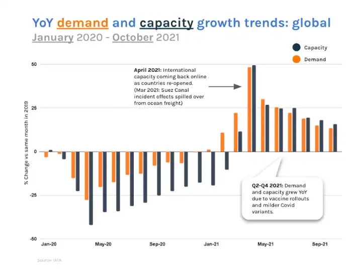 • Demand for air freight remains high as Covid outbreaks across Europe have led to widespread test-shortages(as a consequence, space for these has been prioritised over other goods), businesses rush to restock low inventories, and enduring customer demand is compounded with congestion and long lead times across other modes. Globally, supply remains elevated with Oct 2021 figures tracking a 15.6% uplift, compared to the same period in 20191.