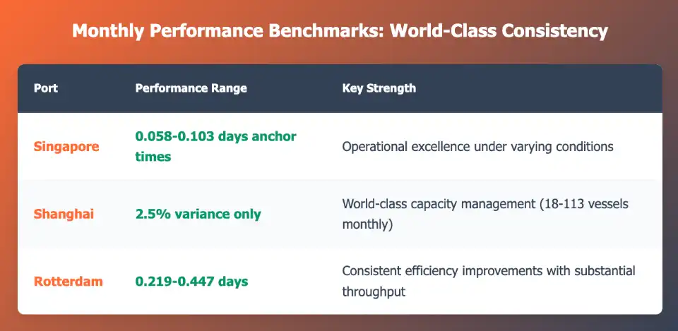 Shanghai: Exhibited remarkable stability with only 2.5% variance while managing massive vessel fluctuations (18-113 vessels monthly), showcasing world-class capacity management.