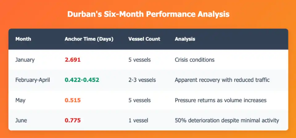 Durban's performance trajectory perfectly illustrates this. The port appeared to recover dramatically froJanuary's crisis-level 2.691-day anchor times to just 0.422 days by March—an impressive 84% improvement that would typically signal successful operational reforms.