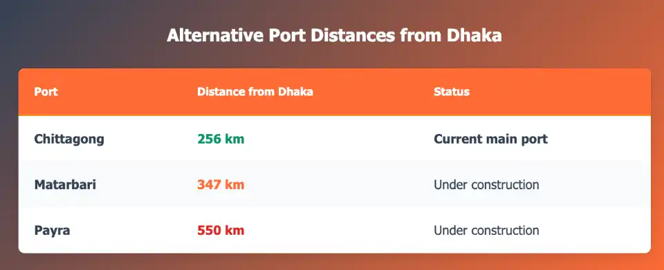 Limited port alternatives highlight how geographic constraints prevent easy load distribution, with new ports Matarbari and Payra located significantly further from Dhaka than Chittagong, raising concerns about effective freight shifting even after construction completion.