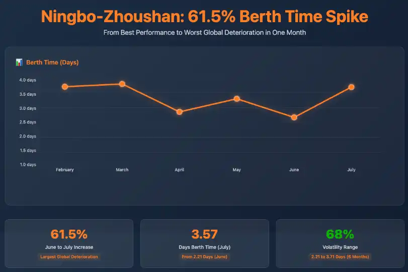 Ningbo-Zhoushanrecorded the largest absolute berth time increase globally, rising61.5% from 2.21 to 3.57 daysbetween June and July 2025. This substantial change at China's third-busiest container port represents the most notable month-over-month deterioration in our dataset and warrants attention from supply chain managers routing cargo through this gateway.