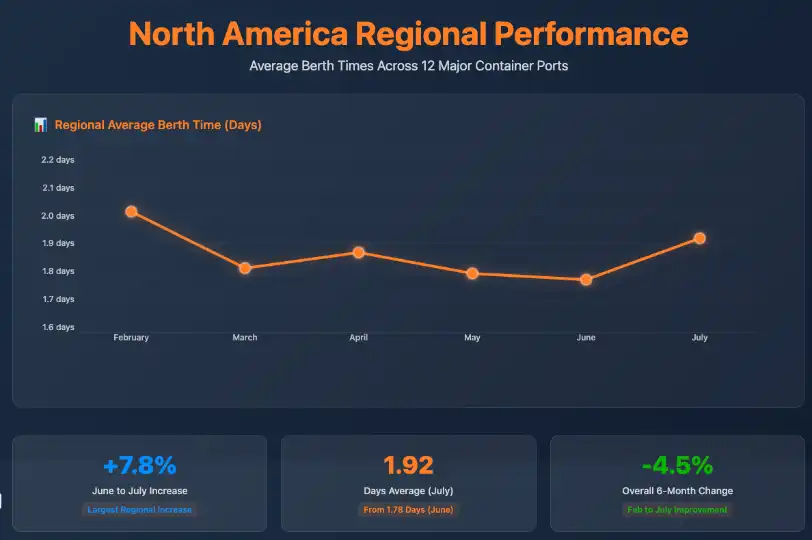 July 2025 showed notable variations in global port berth times, with some significant increases at major container hubs alongside efficiency improvements at others. According to our July 2025 port performance data,North America recorded the largest regional average increase(+0.14 days) while individual ports showed considerable variation in performance.